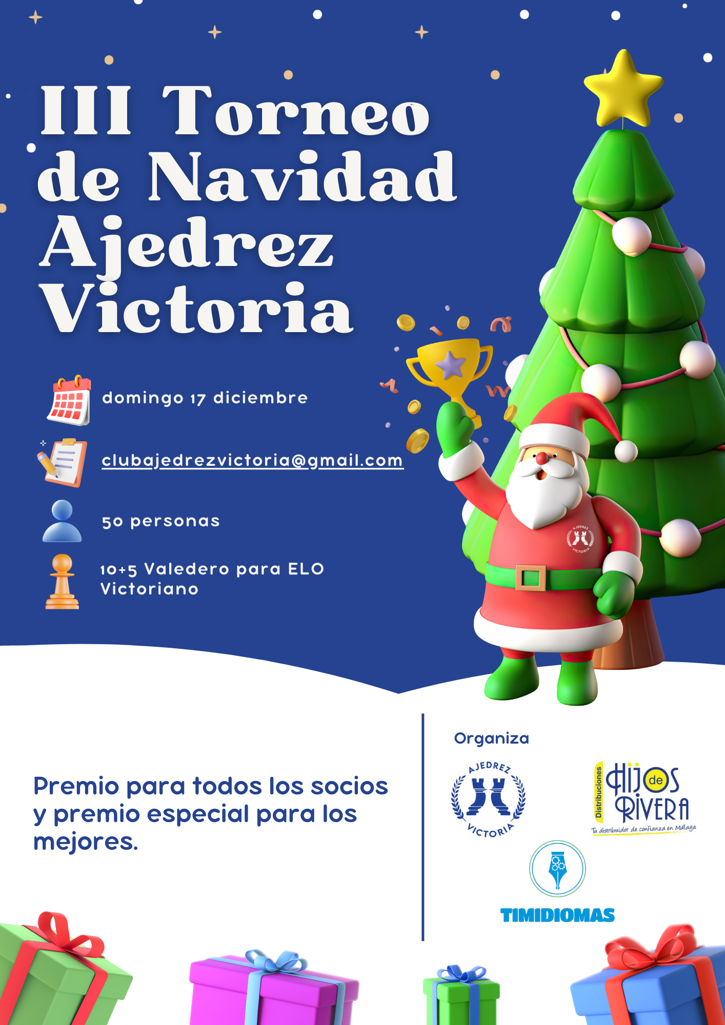 Con las Navidades a la vuelta de la esquina, hemos celebrado el tercer torneo social de rápidas del curso, coincidiendo con el III Torneo de Navidad Ajedrez Victoria. Un torneo en el que nuestro Club ha reunido a gente de muy diversa procedencia para disfrutar de una bonita mañana de convivencia, en la que 43 jugadores se han dado cita para poner en práctica su afición por el ajedrez, en TIM Idiomas, nuestro colaborador incondicional sin el que nada de esto sería posible.